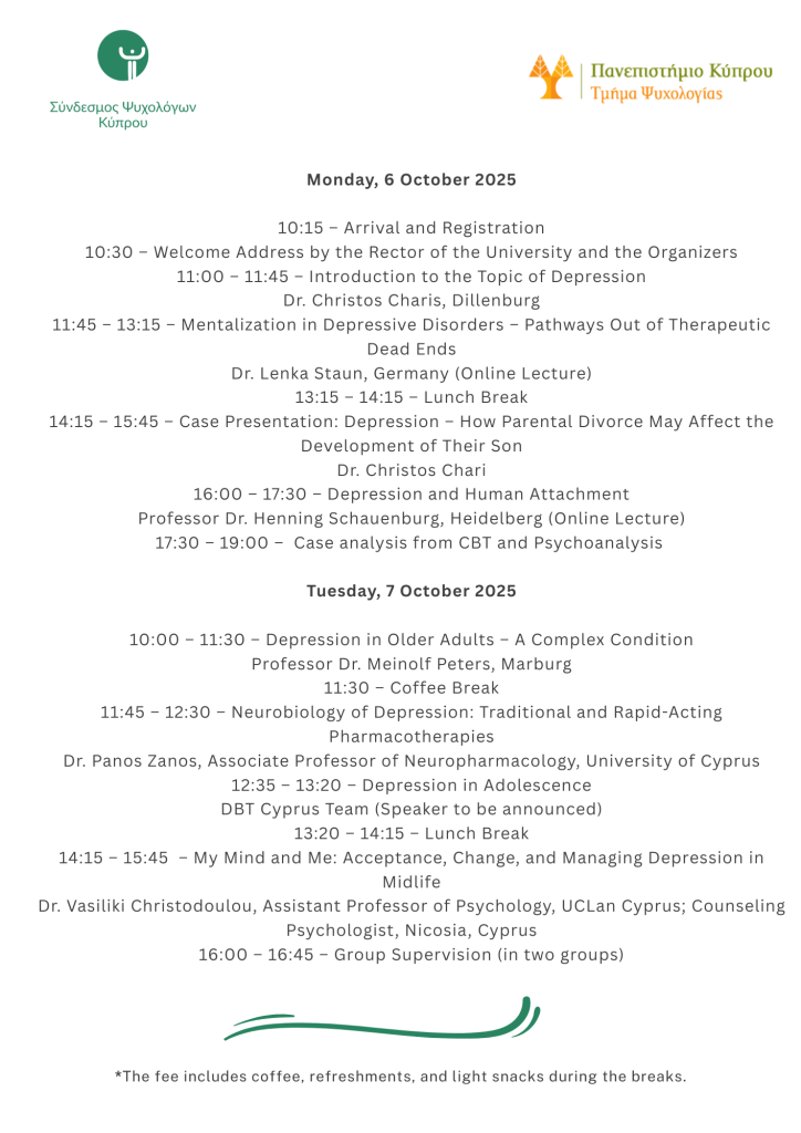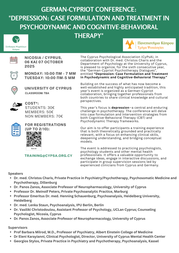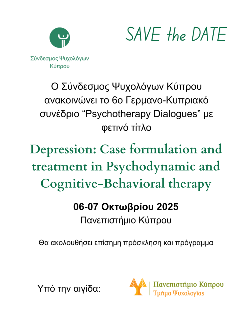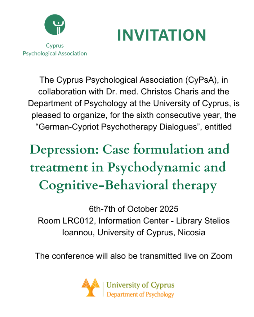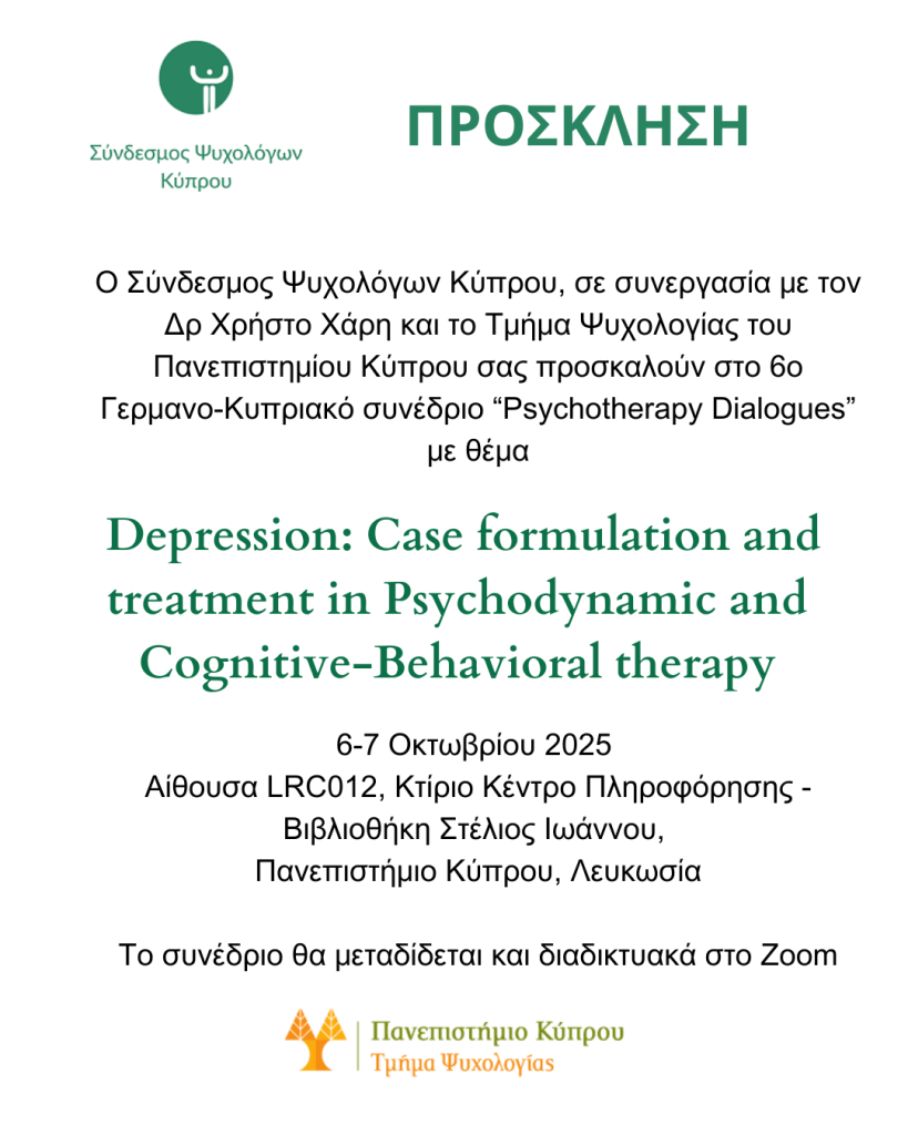 The Cyprus Psychological Association (CyPsA), in collaboration with Dr. med. Christos Charis and the Department of Psychology at the University of Cyprus, is pleased to organize, for the sixth consecutive year, the “German-Cypriot Psychotherapy Dialogues”, entitled “Depression: Case Formulation and Treatment in Psychodynamic and Cognitive-Behavioral Therapy.”